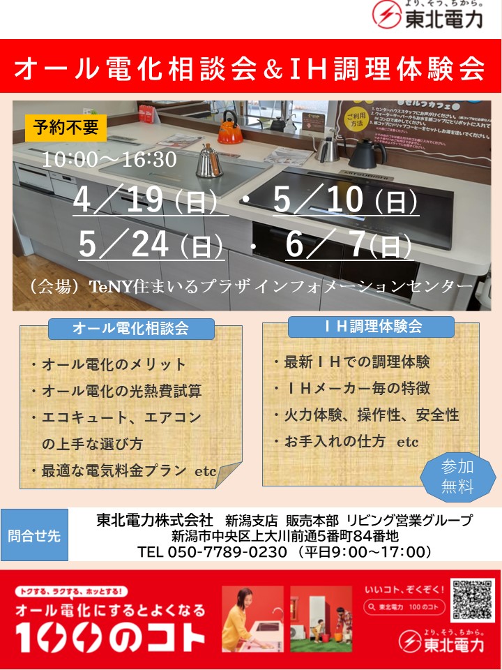 東北電力では、4月の「まるっと見学デー」に合わせ、オール電化相談会と最新のIHクッキングヒーターを使った調理実演・体験会を実施します! 最新のIHクッキングヒーターの特徴や使い勝手、安全性などを、ご自身でお確かめください。オール電化の疑問やおトクな電気料金プランにもお答えいたしますので、ぜひお気軽にお立ち寄りください。 事前予約は不要です。混みあった場合は、少々お待ちいただくことがございます。※東北電力では、4月~6月の「まるっと見学デー」に実施予定です。