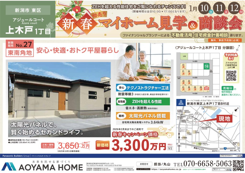 新年あけましておめでとうございます! 1月10日(土)・11日(日)・12日(月祝) 新潟市東区上木戸1丁目にて新春マイホーム見学&商談会を行います。 2026年2月末までのご成約で新春キャンペーン価格3,300万円(税込)となります。 分譲地は残り1区画となっております。 ご参加お待ちしております。