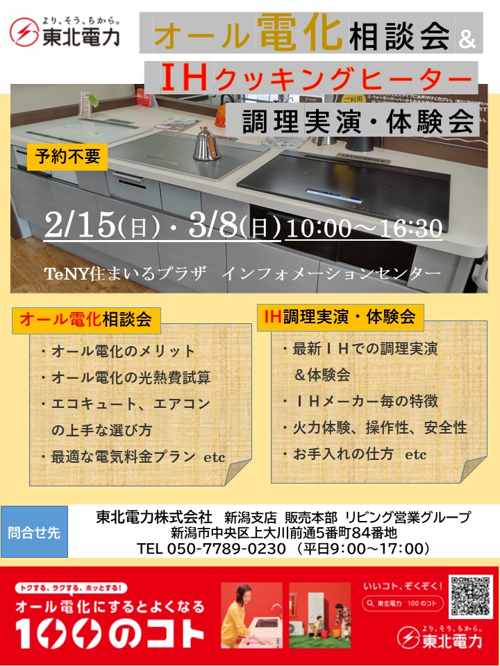 東北電力では、1月に続き、2月・3月の「まるっと見学デー」に合わせ、オール電化相談会と最新のIHクッキングヒーターを使った調理実演・体験会を実施します! 最新のIHクッキングヒーターの特徴や使い勝手、安全性などを、ご自身でお確かめください。 また、オール電化の疑問やおトクな電気料金プランにもお答えいたしますので、ぜひお気軽にお立ち寄りください。 事前予約は不要です。混みあった場合は、少々お待ちいただくことがございます。