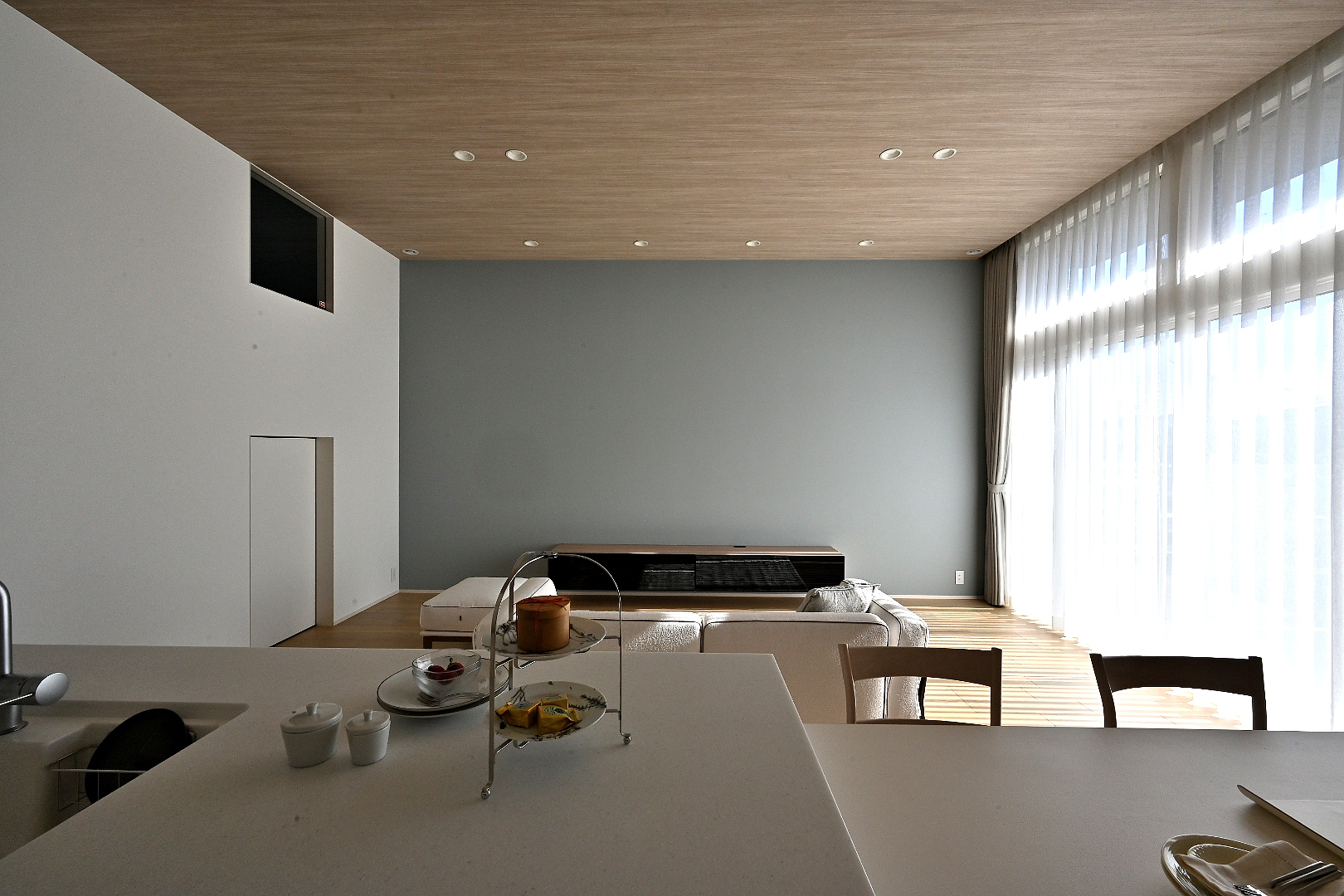 ●一体空間20帖のLDKの天井高は3m、木目調の天井がアクセントに